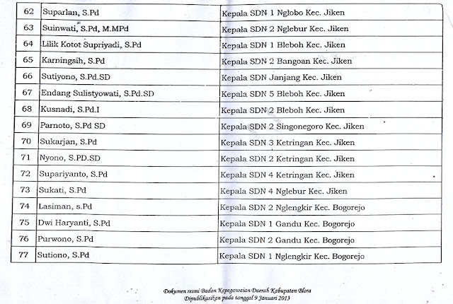 Awal Januari 2013 Pelantikan Kepala Sekolah 9 Januari 2013 by tabloid infoku - January 09, 2013 Keputusan Bupati Blora Nomor : 821.2/12/2013 Lihat BesaR Gambar klik kanan pilih open New Tab atau Buka tautan Baru